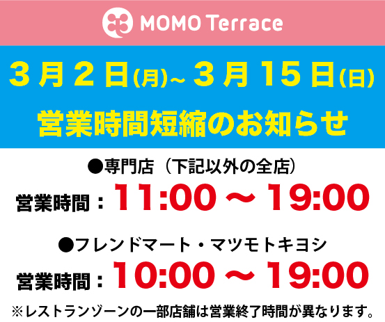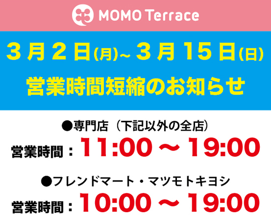 下記期間の営業時間を変更いたします。期間: 2020年3月2日(月)~2020年3月15日(日)