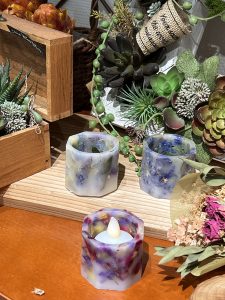 ボタニカルランタンは、カップ型に色とりどりのお花を溶かしたキャンドルで閉じ込めて固めます。