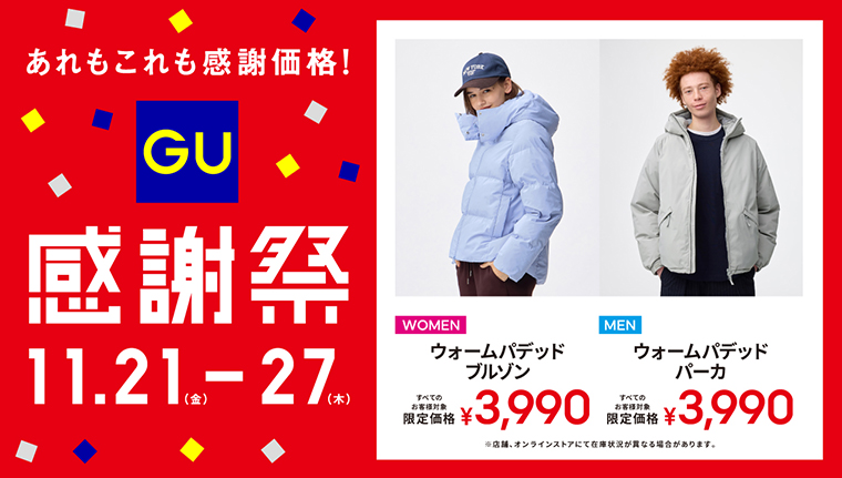 11/21からユニクロとジーユーの合同感謝祭がスタート!! この冬大活躍のウォームパデットアウターやスウェット、マシュマロジップパーカー等目玉商品が、全てのお客様を対象とした全員限定で最大1,000円OFFとお買い得に!! 他にも大人気コラボ等嬉しいニュースも多数用意しております! 是非店頭に来ていただき感謝祭をお楽しみください!