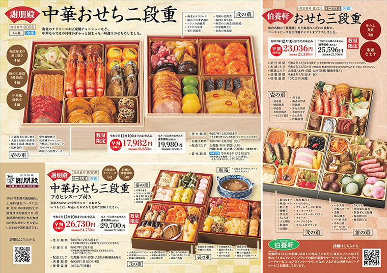 厳選された食材を使って豪華に! 多彩な味わいの中華フルコースおせち。 和食やローストビーフなどの洋風テイストをプラスしたおせち。 新年に欠かせないのが健康や幸福を願う”おせち”ですよね。 家族の笑顔が集まる瞬間を、華やかなおせちと一緒に彩ってみませんか? ***今だけ早割10%OFF*** お早めにお申し込み下さい。